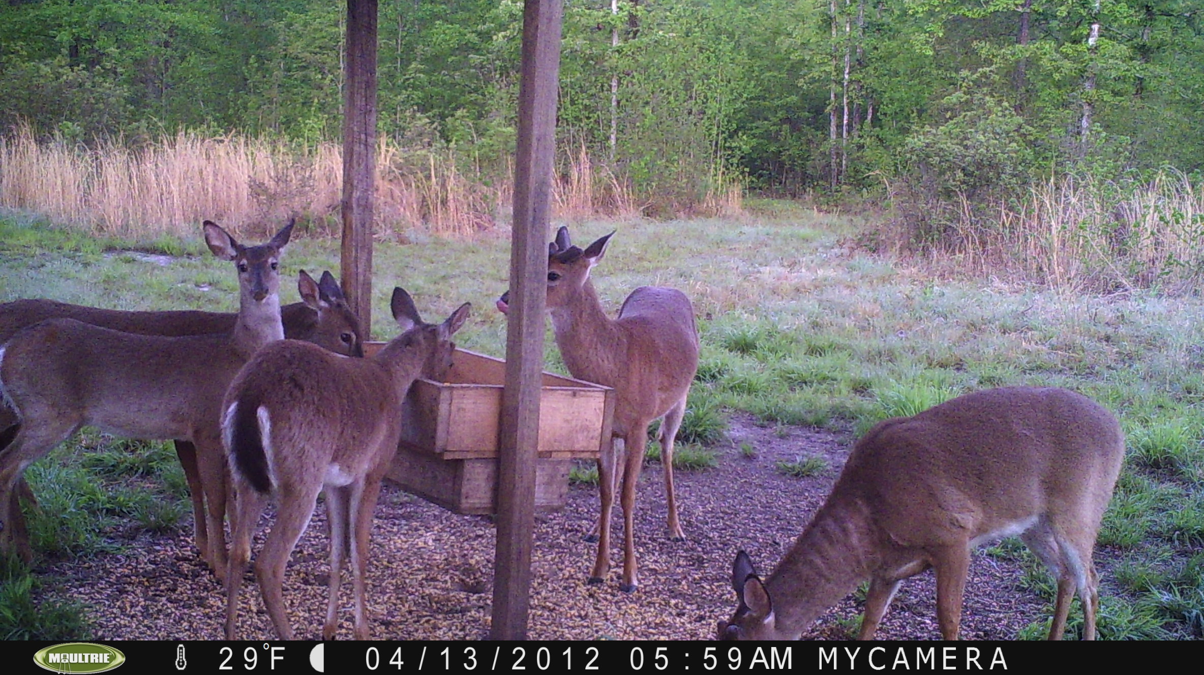 Click on the image to further enlarge. Here he is on 4/13 and his antlers have grown another inch or so. You can now see the makings of a fork, but just barely. Should be more distinct in about a week.