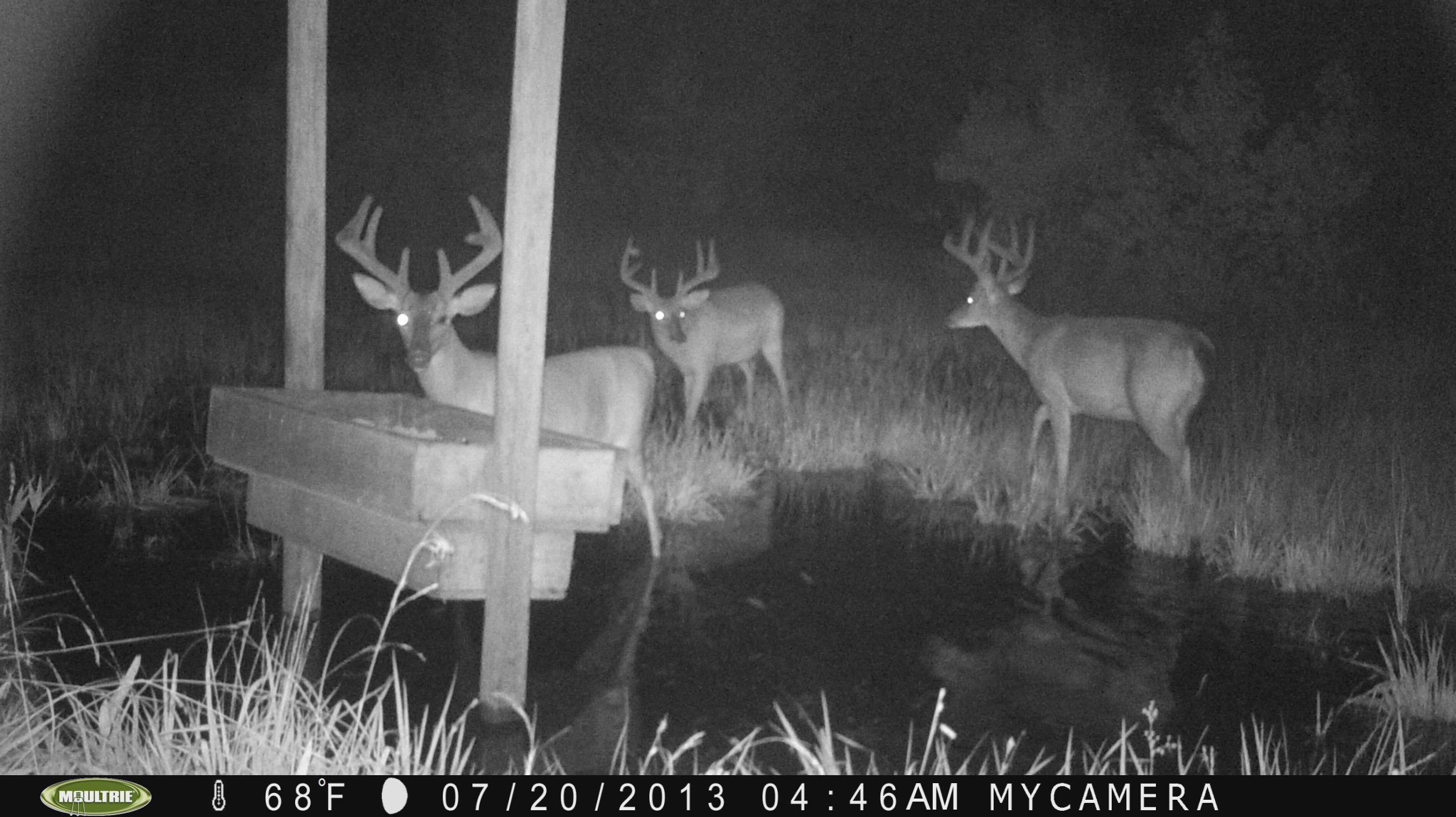 Click image to further enlarge. July 20th- three great looking shooter bucks. Different feeder on same property. One of theses bucks in in the previous photo, maybe two of them.