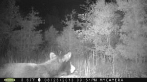 Click image to further enlarge. August 23rd- Finally got a better picture of the bear, this time at night. Still can’t tell exactly how large he ( or she ) is. Doesn’t look too big however.